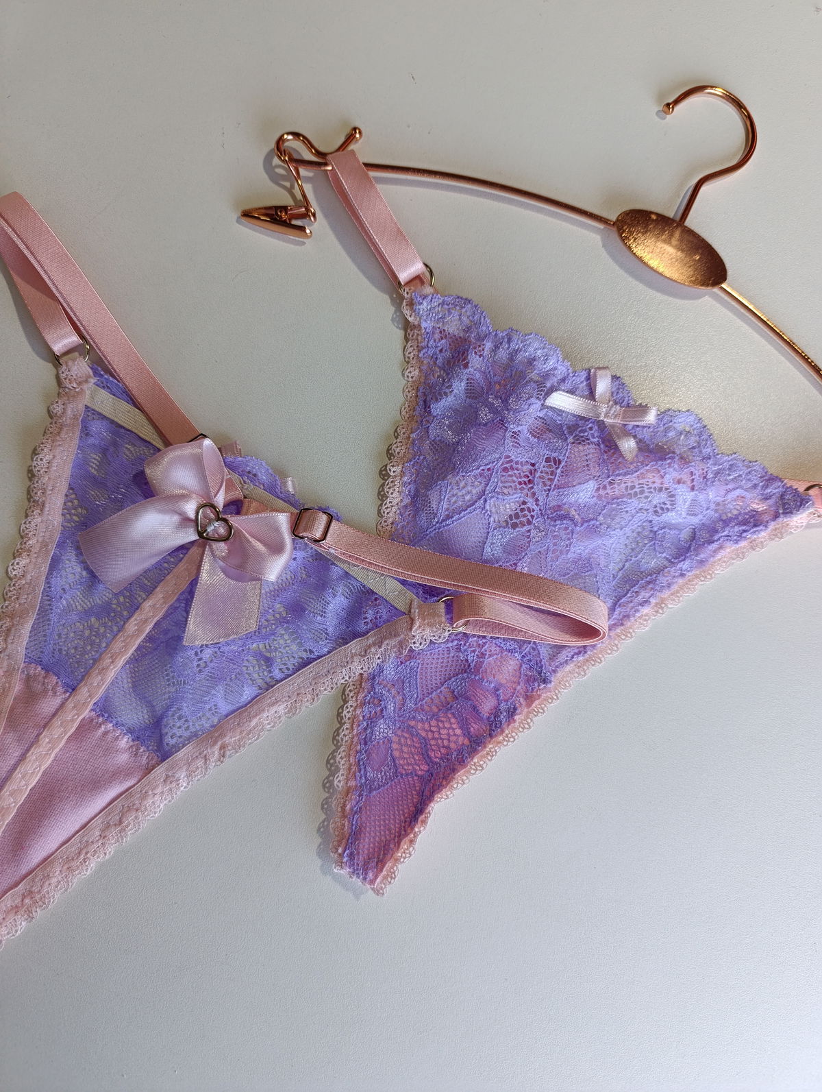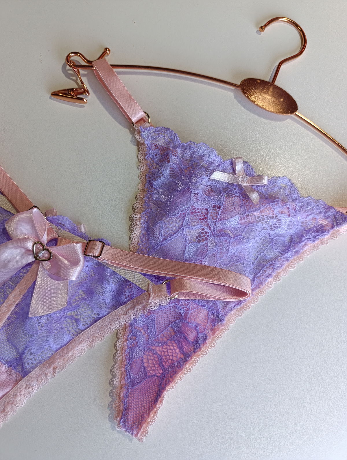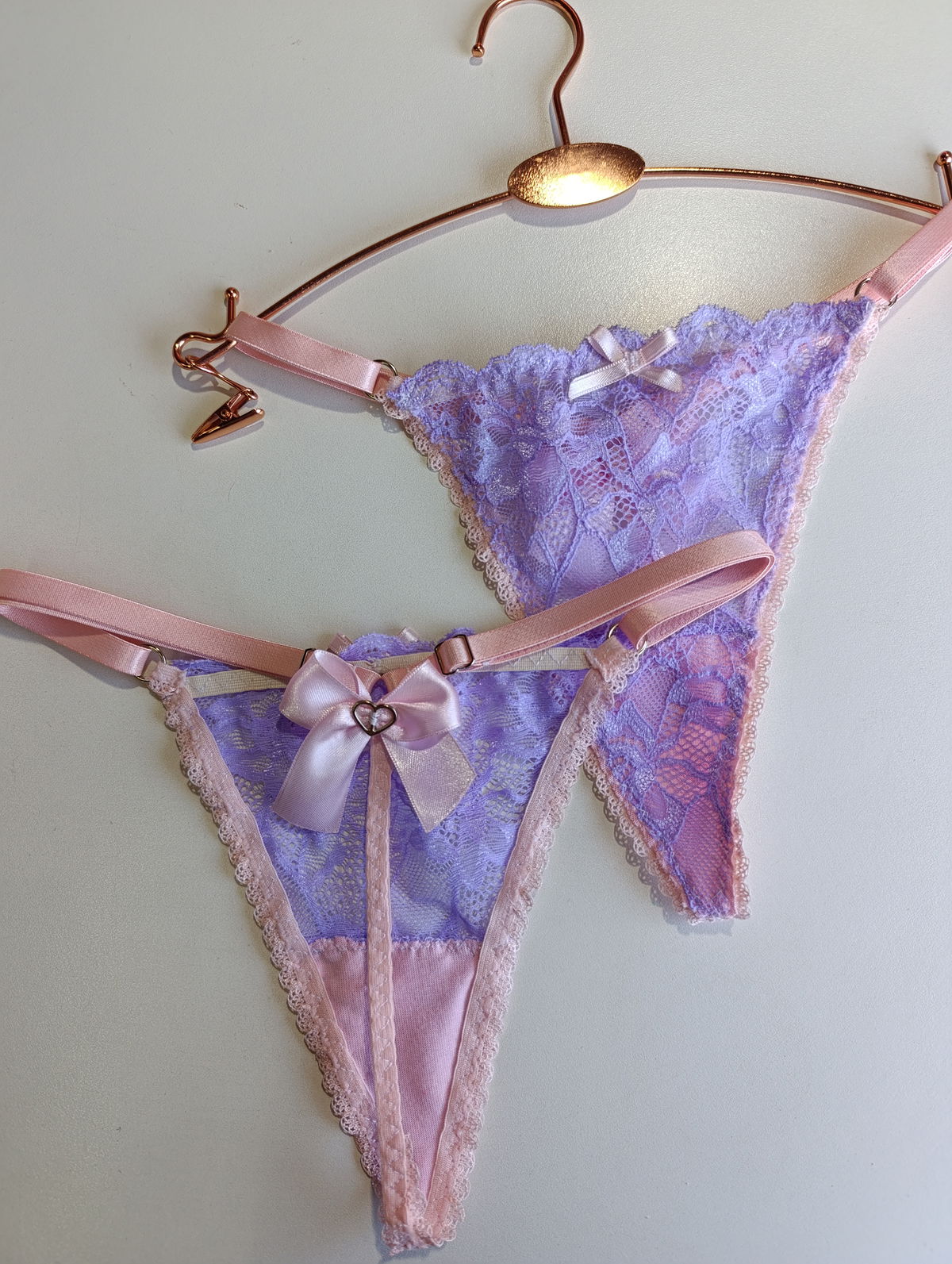 Tanga hilo de puntilla lila con detalles rosas